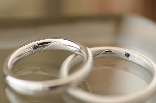 二人だけの思い出の場所から見える富士山を彫り込みました。月に見立ててブルーサファイアを左右に留めています。