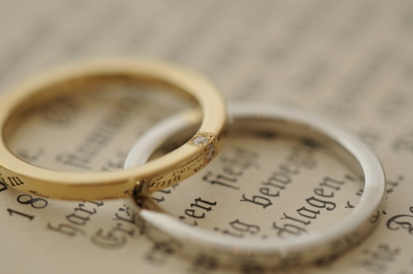 四角いリングに、女性には3面にダイヤモンドが入っています。ダイヤは彫留めで、トップ、両サイドのダイヤの周りにはミルグレインを施しました。